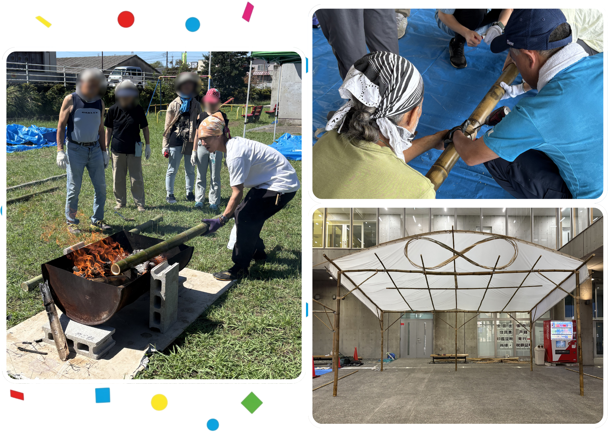 竹の切出し、採寸、油抜き(耐久性を高めるために火で炙る作業)、金具取付け、組立てを行い、ステージとして完成!